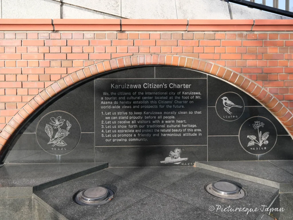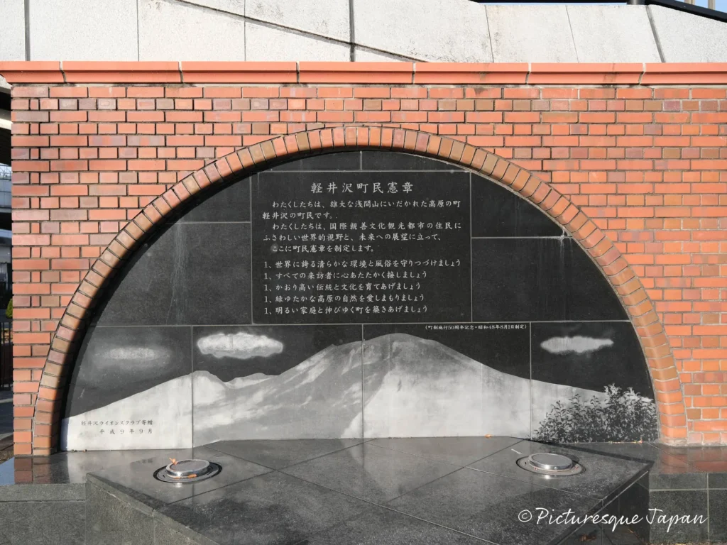 軽井沢駅の北口の階段下には「軽井沢町民憲章」のモニュメントがありますが、ここには軽井沢町が大切にしてきた自然・文化・暮らしの姿勢を、町民の約束として言葉にしたものが記されています。