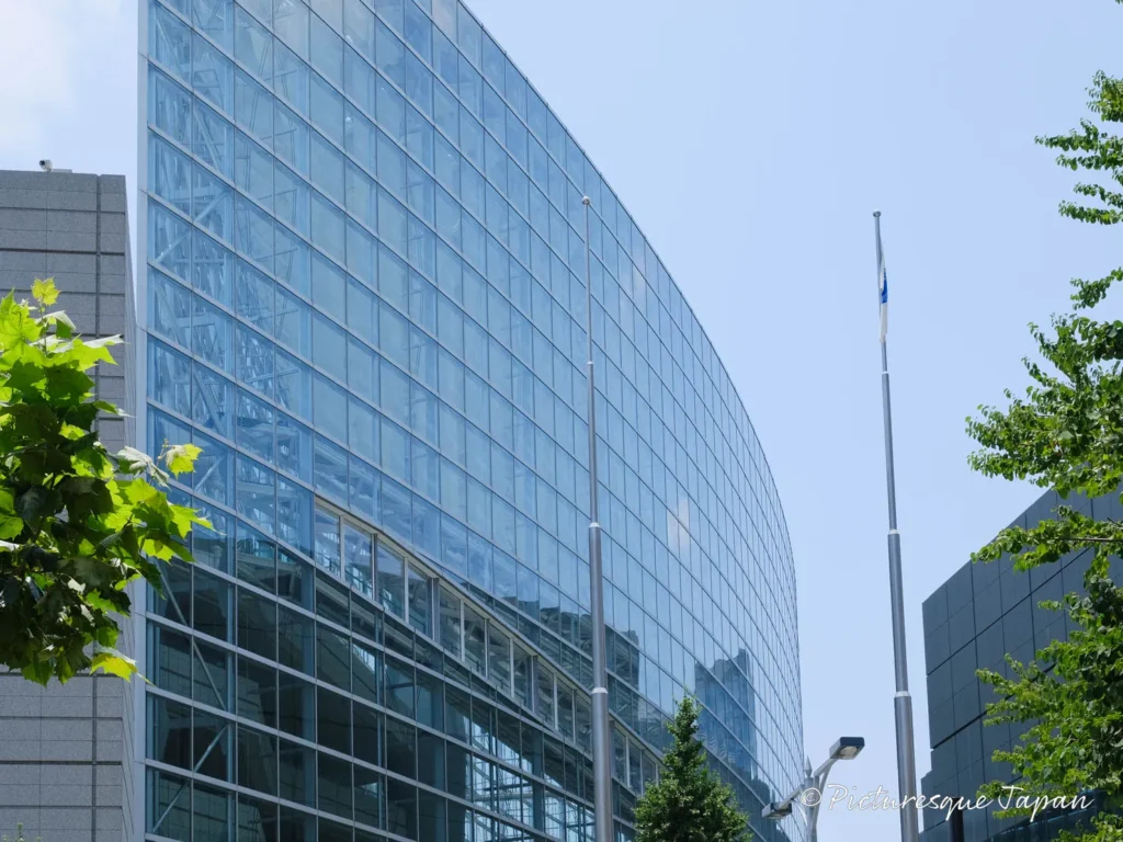 写真の左側がガラス棟、右側が会議室群。中央の地上広場を挟んで左右に配置されています。