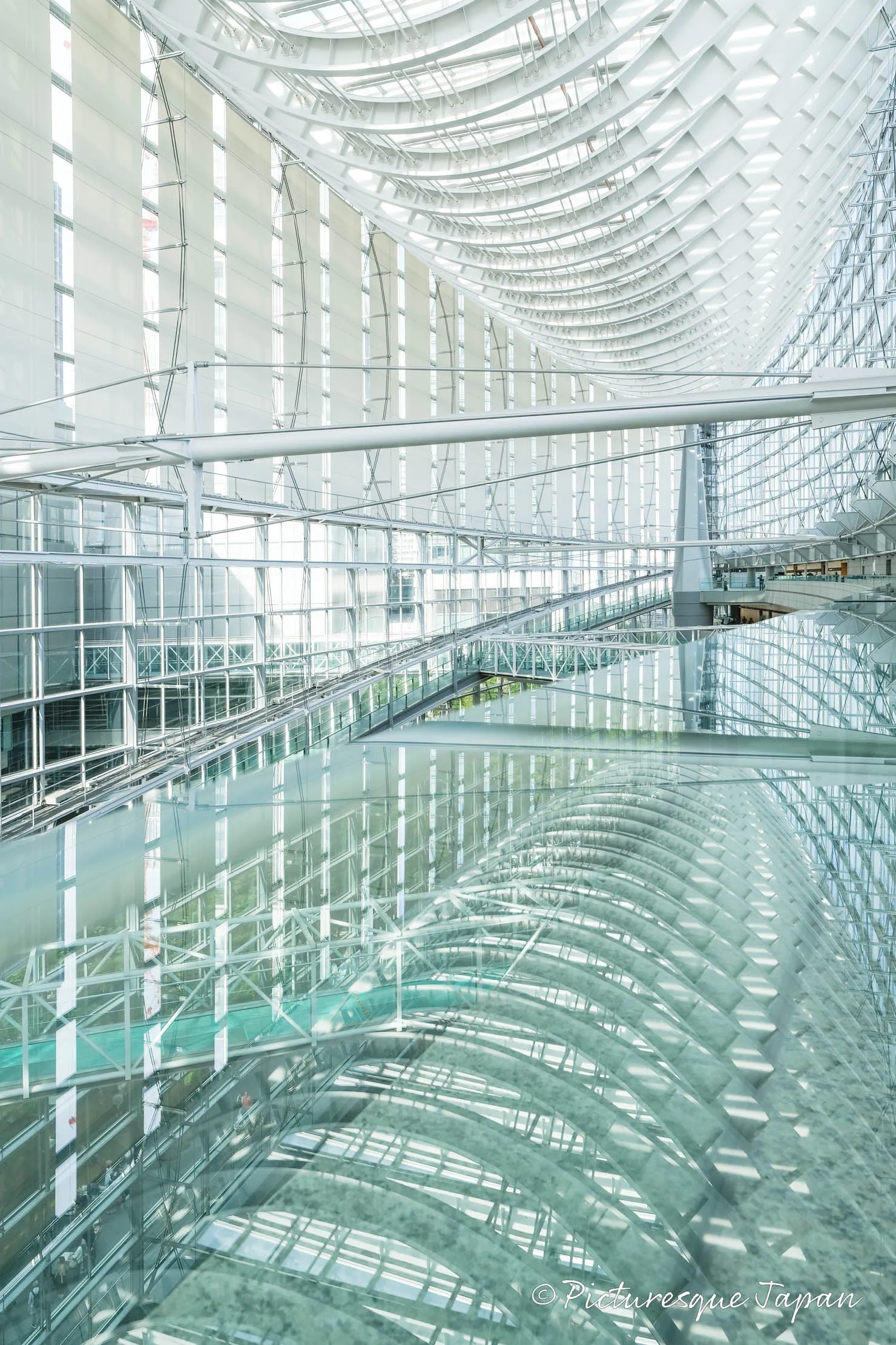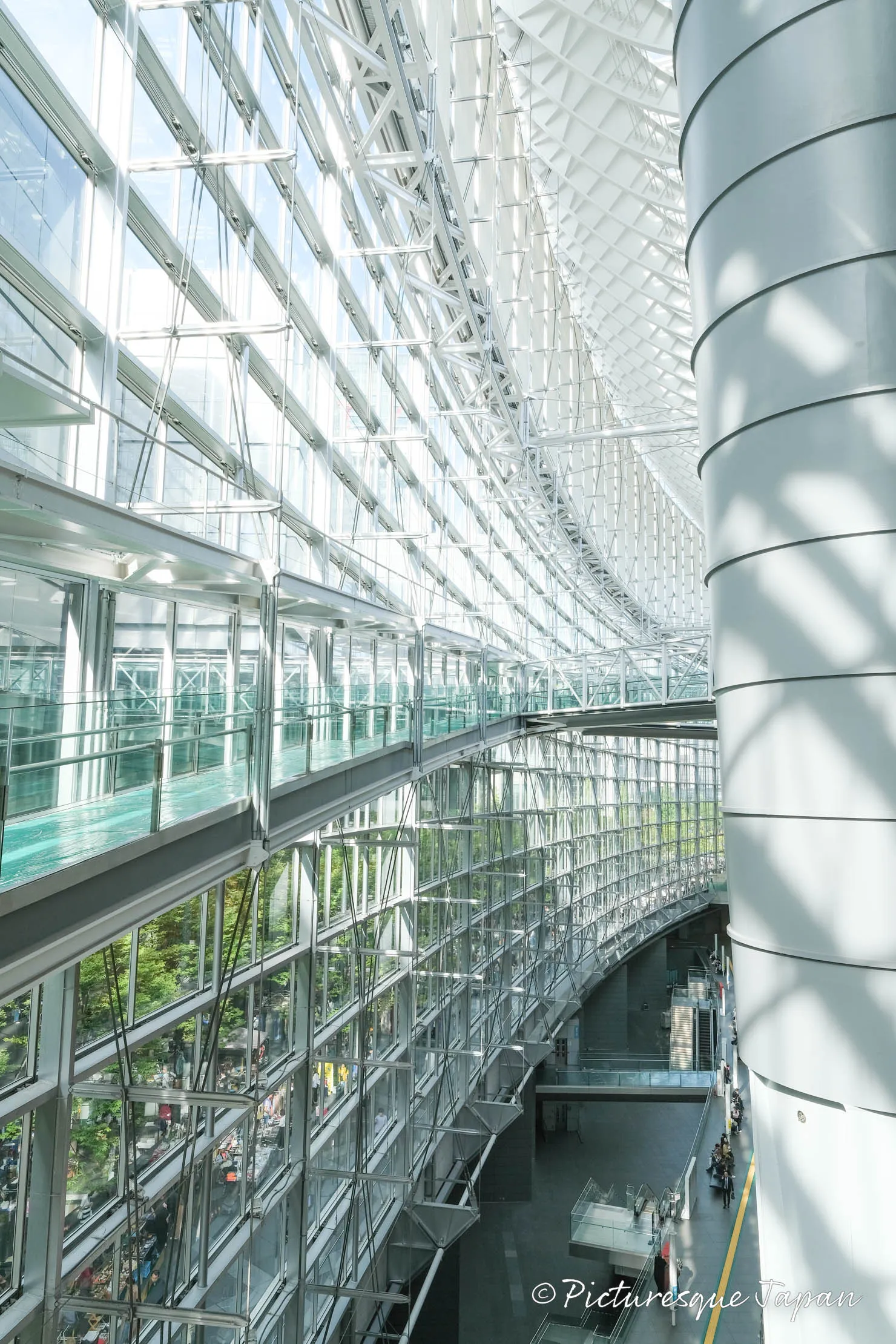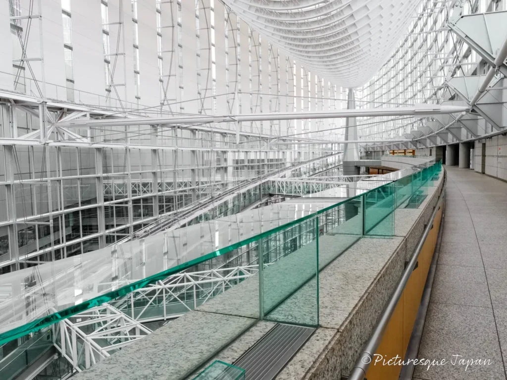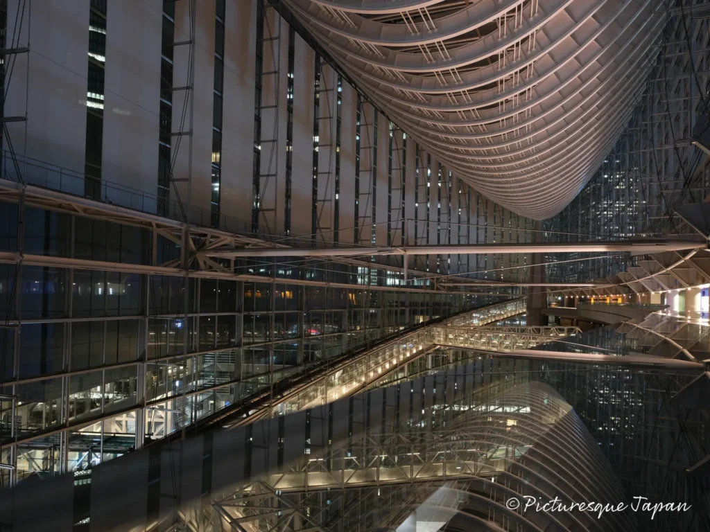 7Fにはガラス製の手すりがあり、そこに天井の鉄骨が映り込み美しい絵を見ることができます。※写真撮影の際はよく安全を確認して、ご自身の責任でご判断ください。