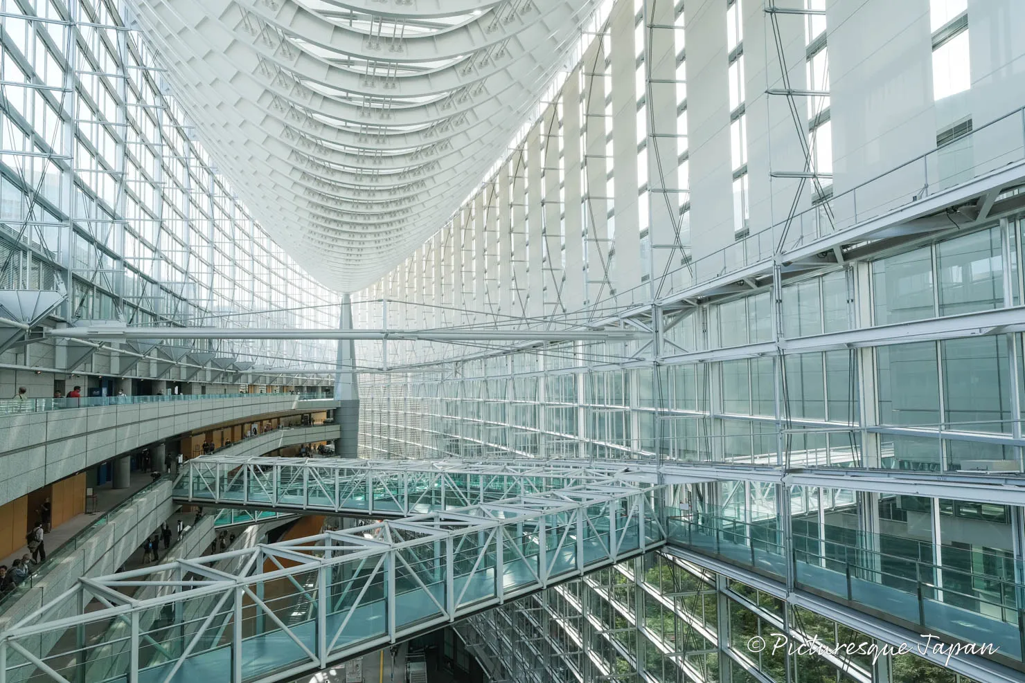 7Fまで登ると、この吹き抜けの大空間を上から眺めることができます。美しい鉄骨はまるで方舟や宇宙船のよう。昼間は太陽の光が差し込み、ガラスに反射した美しい景色を眺めることができます。